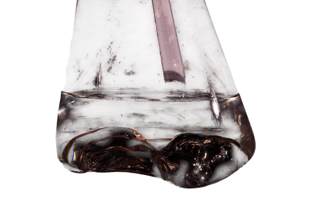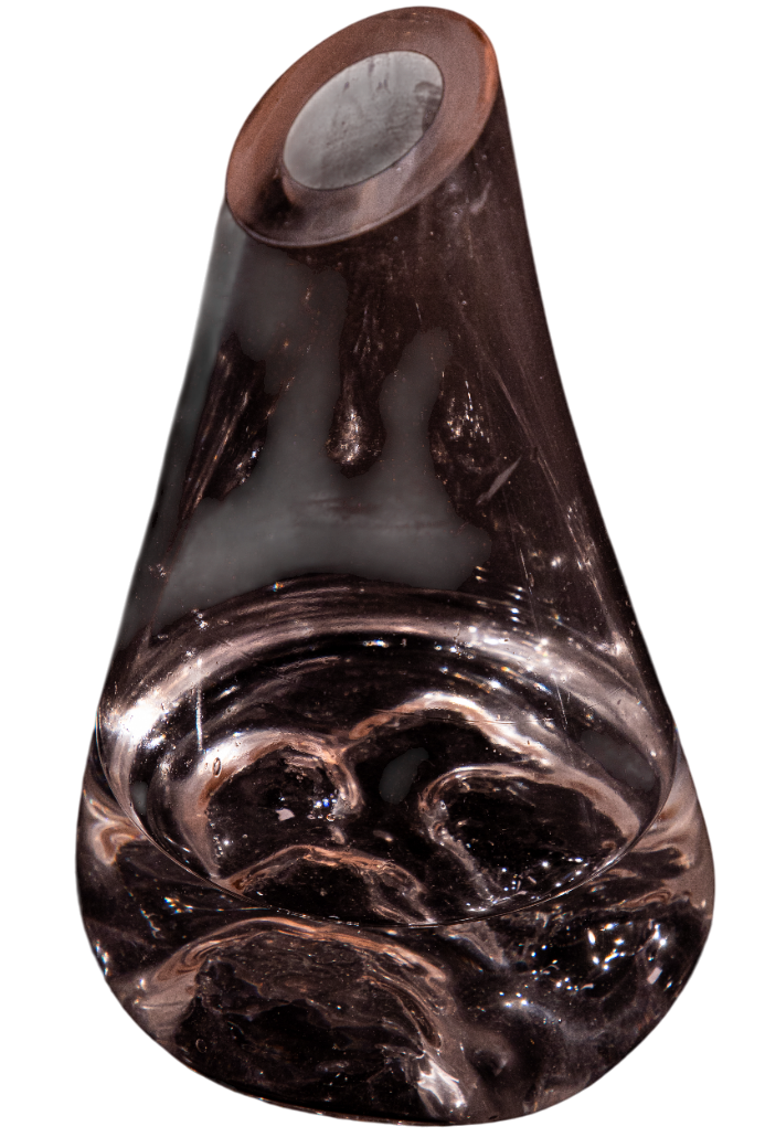 This water jug, made of transparent blown glass, has a base carved with patterns reminiscent of the texture of stones. The combination of the delicate glass and the solid base creates a balanced contrast between lightness and strength.