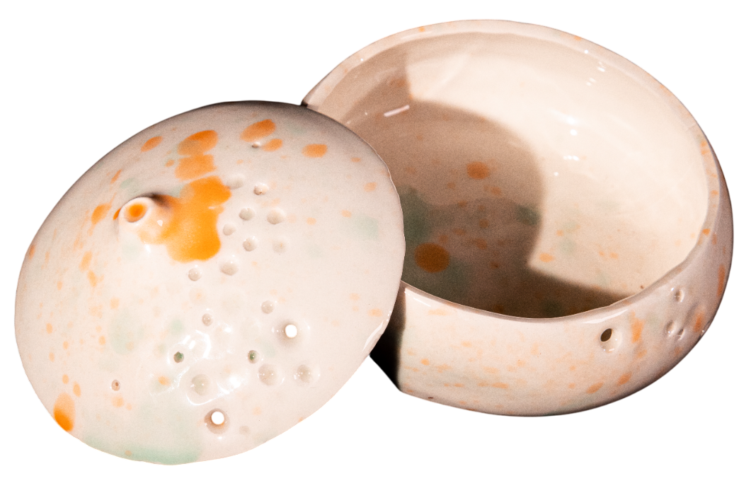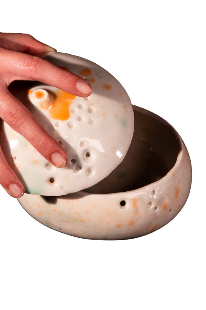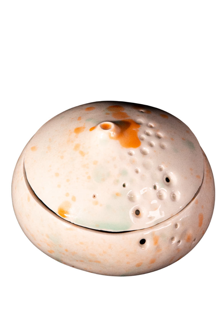 This container is the result of an innovative experiment with plaster. The piece was created by filling a balloon with liquid plaster, which, when solidified, was molded to give shape to the object.